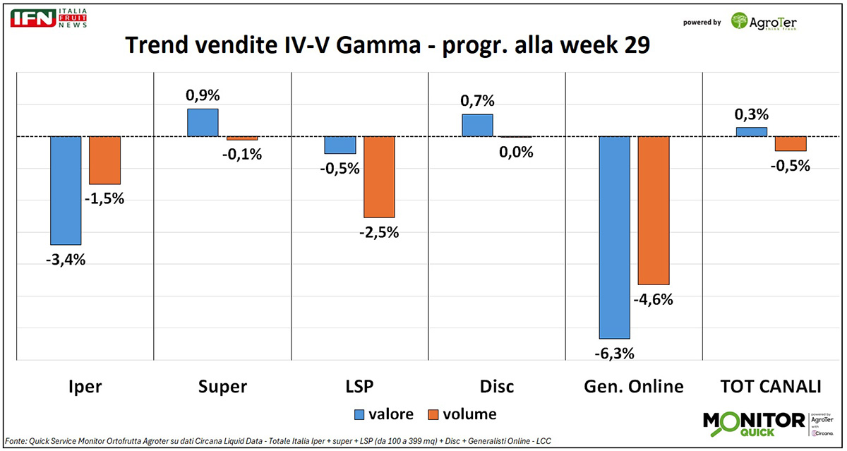 Tra i canali più importanti, rimane in difficoltà l’ipermercato insieme al libero servizio, mentre le superfici di dimensione intermedia (supermercato e discount) se la cavano meglio. La vendita di IV Gamma tramite e-commerce, invece, pare un po' una chimera a oggi, nonostante le enormi potenzialità.