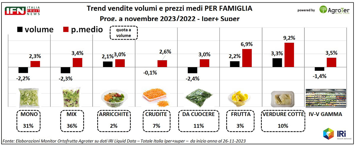 Analizzando le singole famiglie si può notare un evidente cambio di passo per quelle prestazioni più basiche, ovvero le insalate mono componente, le cruditè, ma anche le verdure da cuocere, spesso accorpate insieme in molti display della Gdo. Per questi tre insiemi di prodotti si registrano volumi che calano fino a settembre (-3,4% per le mono, -0,7% nelle cruditè e -4,2% nelle verdure da cuocere), ma che crescono tra ottobre e novembre (rispettivamente +4,8%, +2,6% e +4,9%) e prezzi medi - addirittura - in deflazione per mono e cruditè, unici casi in tutto lo scaffale, e in forte attenuazione per le verdure da cuocere.