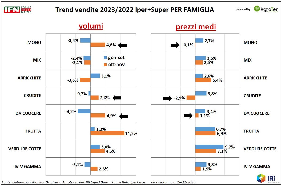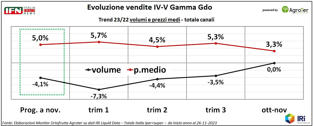 Tuttavia, se spacchettiamo le performance delle sette famiglie di prodotto nei due periodi pre e post autunno, si notano andamenti molto diversi per alcune di queste: IV-V Gamma, nel complesso, passa da perdere 2,1 punti a volume, tra gennaio e settembre, a guadagnarne 2,3 tra ottobre e novembre, con un’inflazione in contenimento (+3,8% nei primi nove mesi, +1,9 negli ultimi due).