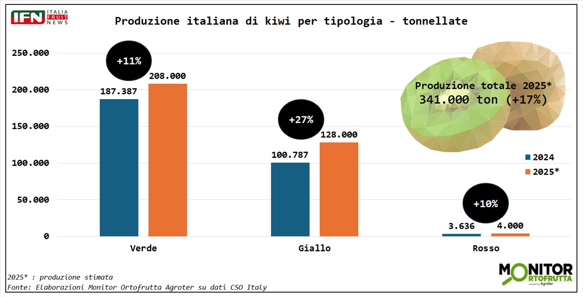Il kiwi verde raggiungerà circa 208.000 tonnellate (+11%), mentre la polpa gialla salirà a 128.000 tonnellate (+27%) e il rosso supererà le 4.000 tonnellate (+10%).