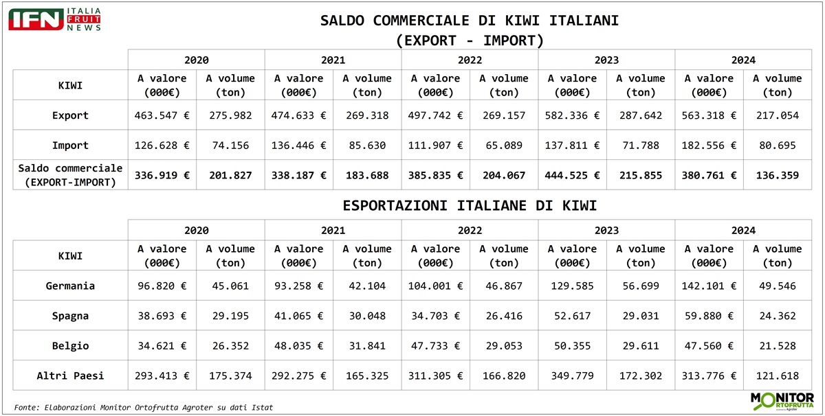 Dopo una stagione positiva, l’export di kiwi italiano si è mantenuto su livelli solidi, con 217 mila tonnellate esportate per un valore di 563 milioni di euro. I volumi risultano in calo rispetto all’annata precedente, ma compensati da un prezzo medio in crescita di circa il 30%.
