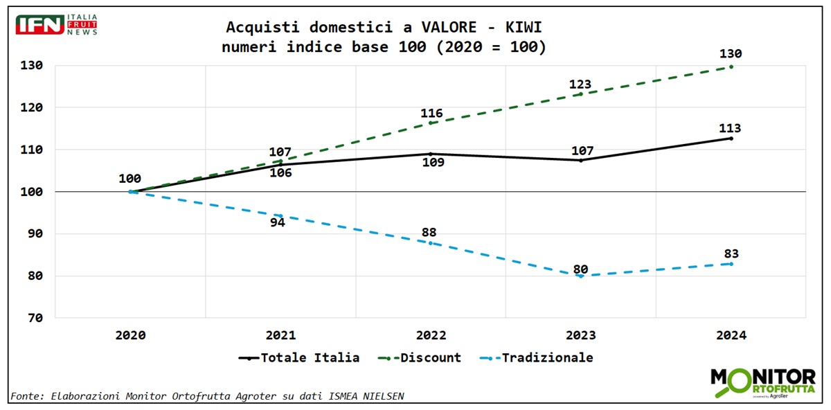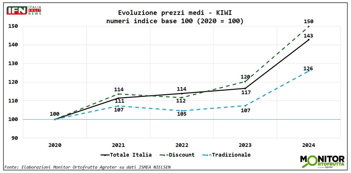 Sul fronte dei consumi domestici di kiwi, il 2024 ha segnato un nuovo balzo dei prezzi su tutti i canali di vendita: in media +26% rispetto all’anno precedente, con un incremento più accentuato nei discount (+30%) e più contenuto nel canale tradizionale. Se si prende come riferimento il 2020, l’aumento medio dei listini arriva al +43%.