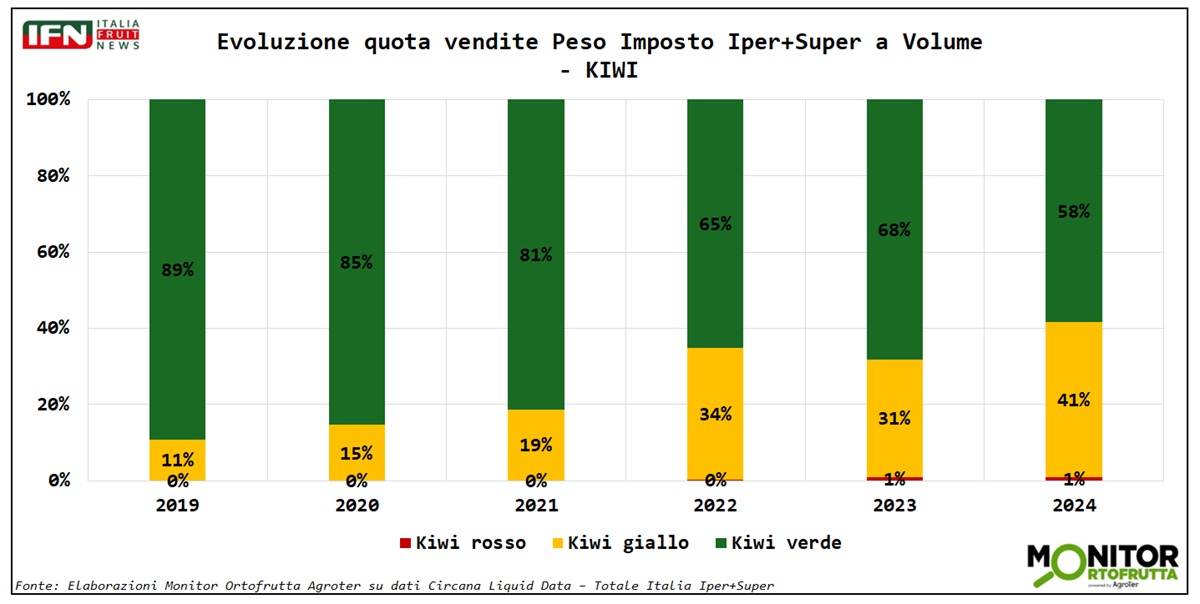 Quando l’aumento dei prezzi non si traduce in un crollo proporzionale delle quantità vendute, significa che l’offerta si sta spostando verso prodotti a maggior valore aggiunto. È il caso del kiwi giallo, che rappresenta il 41% del prodotto confezionato (il quale incide per il 45% sul totale) nel canale iper+super, ma arriva a pesare il 55% in termini di valore: una conferma tangibile del successo crescente di questa tipologia premium.