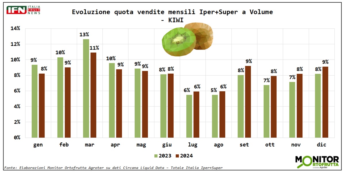 Chiudendo con la stagionalità, le vendite mensili di kiwi nel canale iper+super ricalcano l’andamento delle mele: picco tra febbraio e aprile (quota tra 9 e 13%), flessione fisiologica nei mesi estivi di luglio e agosto, ma senza cali bruschi, e livelli stabili nel resto dell’anno. Si tratta dunque di un prodotto ormai destagionalizzato, caratteristica che apre la strada a strategie di marca sempre più incisive e determinanti per il posizionamento della categoria. (bf)