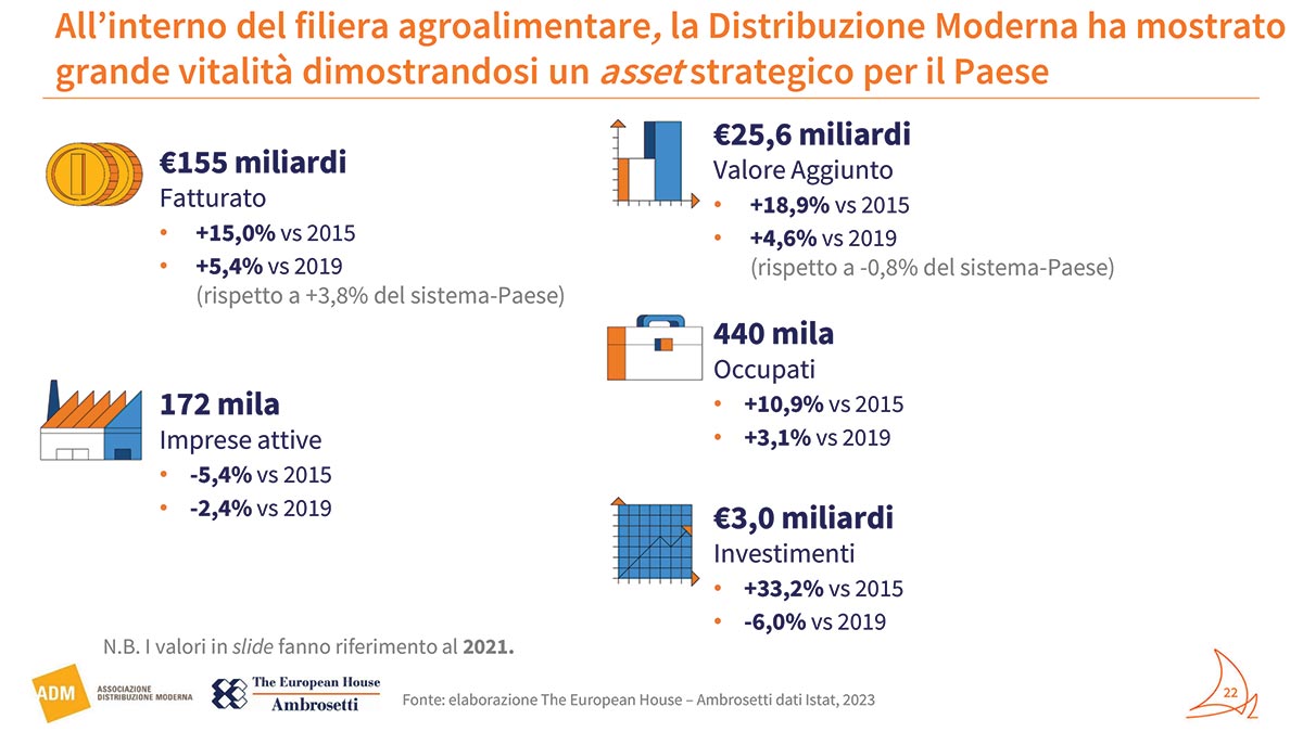 Un contributo rilevante che la DM continua tutt’ora a svolgere insieme a tutte le imprese del largo consumo, ma che necessita anche di un’azione del Governo a sostegno della domanda e della filiera, come ha evidenziato il Presidente di ADM Marco Pedroni. “La Distribuzione Moderna ha dimostrato di essere un comparto importante per l’economia del Paese, un attore dinamico della filiera agroalimentare che contribuisce alla crescita del settore e delle molte PMI che costituiscono l’ossatura portante del made in Italy e che hanno trovato nei lunghi rapporti di fornitura con le aziende distributive una base di stabilità commerciale e uno stimolo all’innovazione di prodotto. Il tessuto produttivo italiano ha in più occasioni dato prova di grande versatilità e capacità di innovarsi, ma è necessario che le istituzioni lo sostengano tutelando il know how nazionale e l’impegno degli imprenditori in una produzione di alta qualità, etica e sostenibile. Perché il Paese possa continuare a crescere, in un contesto di elevata inflazione è necessaria anche un’azione di sostegno ai consumi interni che valgono il 60% del PIL”.