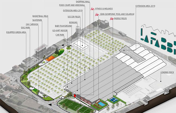 Costata 40 milioni di euro, la Fabbrica di Salerno è una struttura polifunzionale, eco-sostenibile e innovativa nella tecnologia di costruzione, a partire dalla facciata con strati di lamiera piena e forata (foto di apertura). All’interno è presente un parco divertimenti al chiuso (chiamato "Blue park"), il più grande d’Italia con 2.500 metri quadri per la famiglia e con diverse attrazioni, dai go kart al bowling. L'area dedicata a sport e benessere offre invece una palestra da duemila mq, piscine, campi da paddle, da calcio e da basket, uno skate park, un solarium e una Spa in cui rilassarsi.