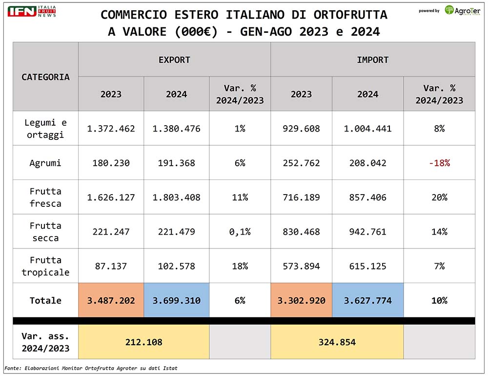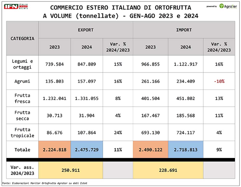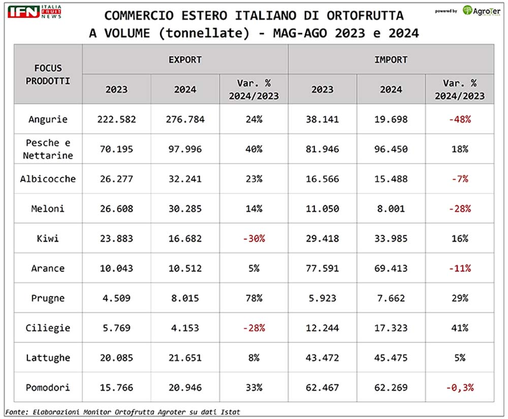 L’upgrade al mese di agosto, grazie alle AnalIsi del Monitor Ortofrutta di Agroter, mostra dati in netto miglioramento, poiché il saldo a valore è tornato positivo e supera di poco 70 milioni di euro, mentre quello a volume è sempre negativo, seppur in miglioramento sia rispetto all’anno scorso, sia al mese di luglio 2024 (clicca qui per approfondire)