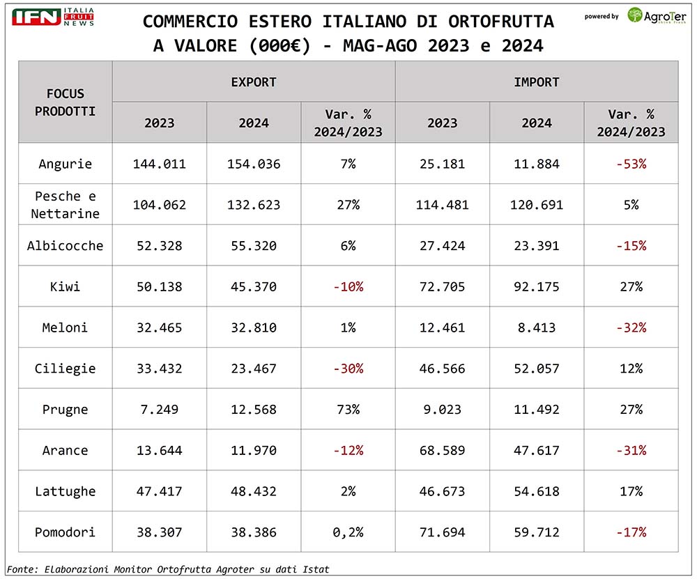 Le angurie primeggiano di gran lunga nella classifica dei prodotti più esportati a volume, con quasi 300 mila tonnellate, in crescita del 24% rispetto a un anno fa. Segue a lunga distanza, con quasi 100 mila tonnellate, il comparto peschicolo che si fa però sotto a valore, grazie a una crescita di circa 30 punti. Molto bene le altre drupacee, come prugne e albicocche, mentre le ciliegie sono state penalizzate dall’annata piovosa che ha compromesso i volumi esportati (-28%) e favorito le importazioni (+41%). Nel melone sono progredite le vendite a volume (+14%), a fronte di un dato a valore pressochè stabile (+1%).