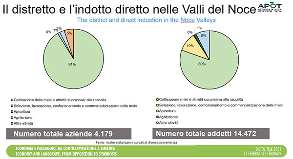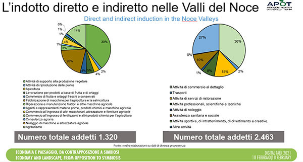 Focalizzando poi l’analisi alle Valli del Noce (Val di Non e Val di Sole), si evince che l’attività primaria e l’indotto diretto rappresentano 4.179 aziende locali e un totale di 14.472 lavoratori, pari a circa il 26% della popolazione di queste zone. “Tutti i servizi che gli agricoltori delle Valli del Noce richiedono - ha proseguito Casa - alimentano altre imprese operanti sul territorio che, a loro volta, fanno lavorare circa 1.320 persone. E non è tutto: i servizi richiesti dagli oltre 14mila addetti dell’indotto diretto (alimentari, istruzione, turismo, svago, ecc.) generano l’occupazione di oltre 2.400 persone”.