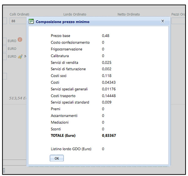 Per ogni tipologia di azienda è possibile impostare un controllo della marginalità su misura e personalizzato. “Ad esempio, l’azienda commerciale - sottolinea ancora Ceccarelli - può determinare quanto liquidare al proprio fornitore: in fase di chiusura dei prezzi di acquisto è possibile esaminare i ricavi ottenuti dalla vendita confrontandoli con i costi ripartiti sul lotto in esame, determinando immediatamente il prezzo di acquisto. E ancora: la cooperativa può calcolare il listino di liquidazione, mentre il consorzio di commercializzazione può indicare il prezzo minino di vendita (nell'immagine soprastante) ai propri commerciali anche istantaneamente. Ad ogni riga d’ordine il sistema propone il prezzo minimo con l’indicazione dettagliata delle componenti di costo".