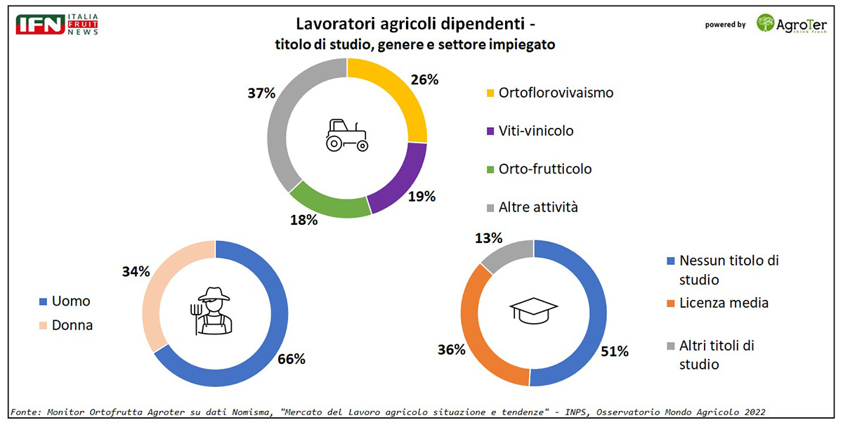 Dalla presentazione, emerge come i settori agricoli che più necessitino di manodopera siano l’Ortoflorovivaismo, il viti-vinicolo e quello orto-frutticolo, assorbendo, rispettivamente, il 26, 19 e 18% della manodopera agricola complessiva. Un punto critico riguarda la formazione: nel 2022, ben il 51% degli operai agricoli non deteneva nessun titolo di studio e il 36% aveva la licenza media. Difatti, come sottolinea Di Tullio “avere una formazione specifica nel mercato del lavoro agricolo non porta alcun vantaggio”.