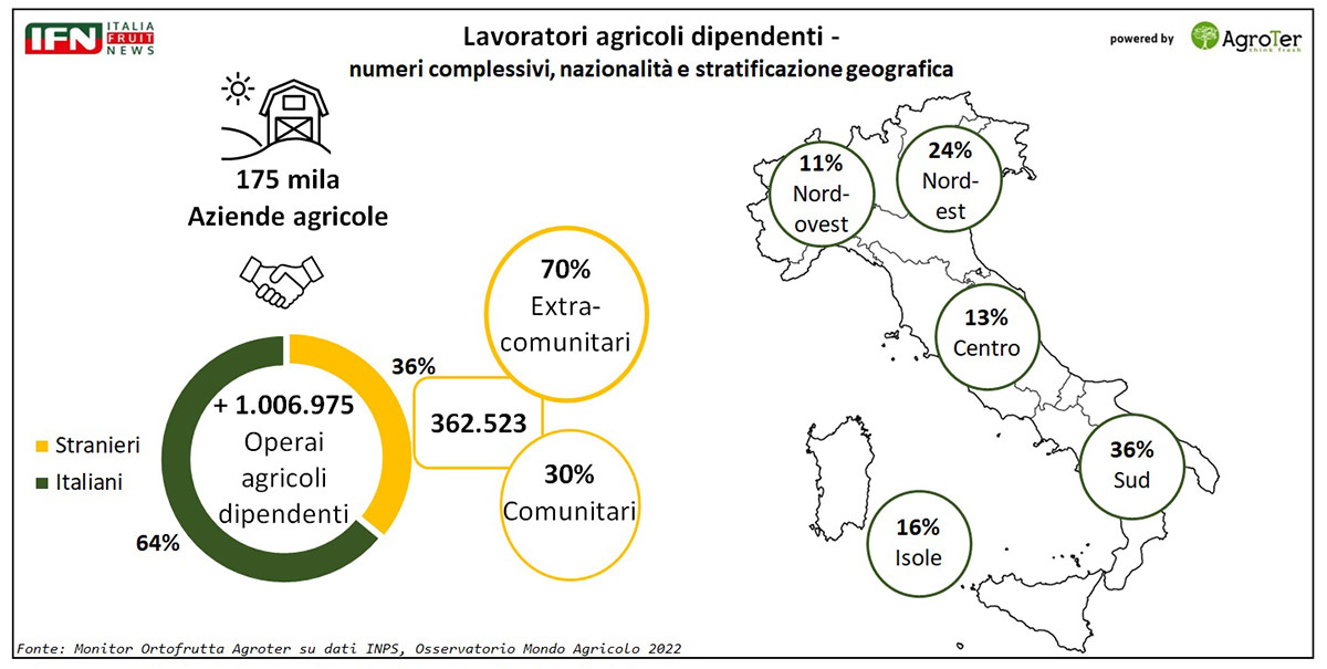 L’ultima parte dell’analisi, non poteva non prendere in considerazione i lavoratori stranieri. Secondo il rapporto “Gli operai agricoli in Italia – Anno 2022” redatto dal Crea sulla base dei dati Inps aggiornati, i lavoratori stranieri nel settore agricolo sono stati pari a 362.523 nel 2022 in aumento rispetto al 2021 di poco più di 1.000 unità, quando erano 361.357; difatti si tratta di circa 36% del totale. Di questi il 70% sono extracomunitari ed il restante 30% sono lavoratori comunitari, un gap che fino a 10 anni fa non esisteva in quanto i due “schieramenti” si equivalevano, ma poi è venuta a mancare buona parte dell’Est Europa che è stata rimpiazzata dagli extra comunitari. Entrando nel dettaglio delle nazionalità, fra i comunitari prevale nettamente la Romania, con oltre il 70% del totale, mentre fra gli extracomunitari non c’è una netta prevalenza ma ci sono 3 paesi appaiati fra il 15 e 17%, ovvero, Marocco, Albania e India.