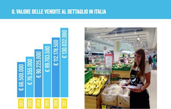 Queste vendite hanno generato, sotto forma di Premio Fairtrade (un margine di guadagno aggiuntivo per avviare progetti sanitari, di emancipazione sociale, o di miglioramento della produzione), un ritorno economico alle comunità di Asia, Africa e America Latina di circa 703mila euro per le banane, 309mila euro per il cacao, 334mila per il caffè e 221mila per lo zucchero.