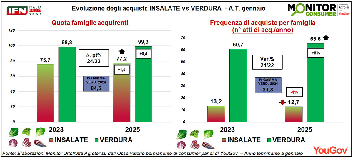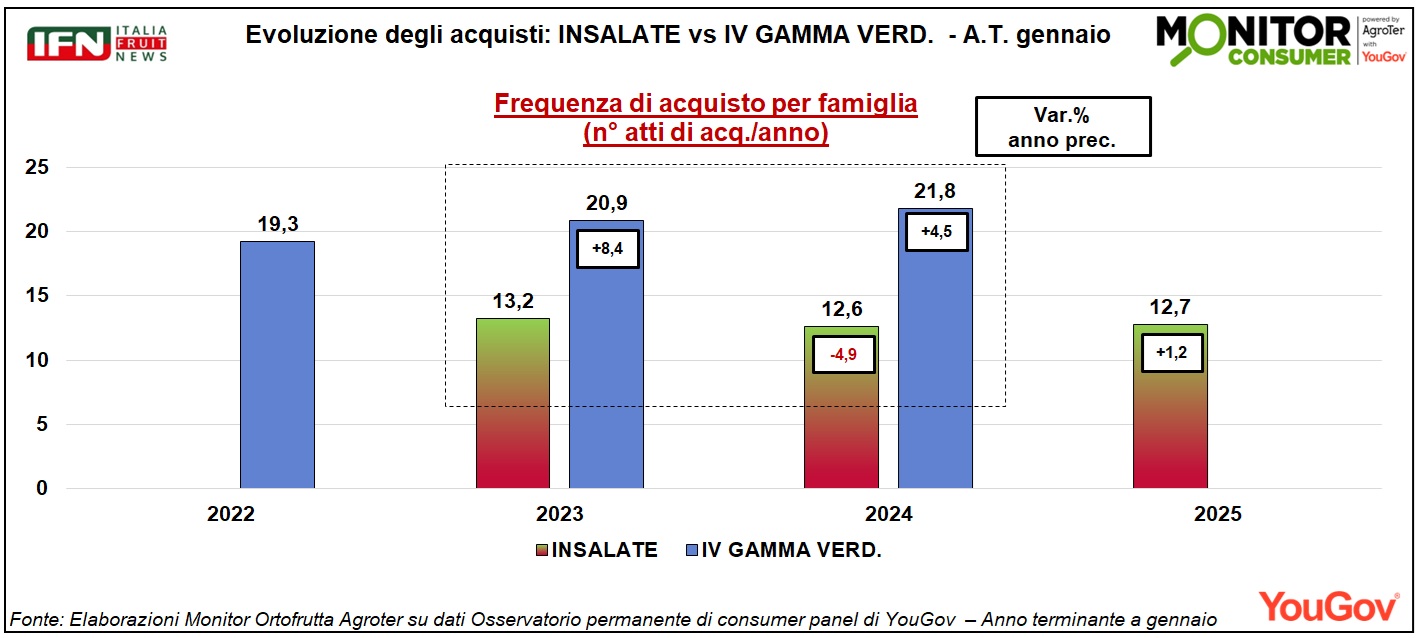 Analizzando la frequenza di acquisto negli anni disponibili per entrambe le categorie, emerge un trend di crescita costante per la IV Gamma. In particolare, tra il 2023 e il 2024 si registra un aumento del 4,5%, mentre nello stesso periodo le insalate di prima gamma subiscono una flessione del 4,9%, seguita da una lieve ripresa nel 2025 (+1,2%).