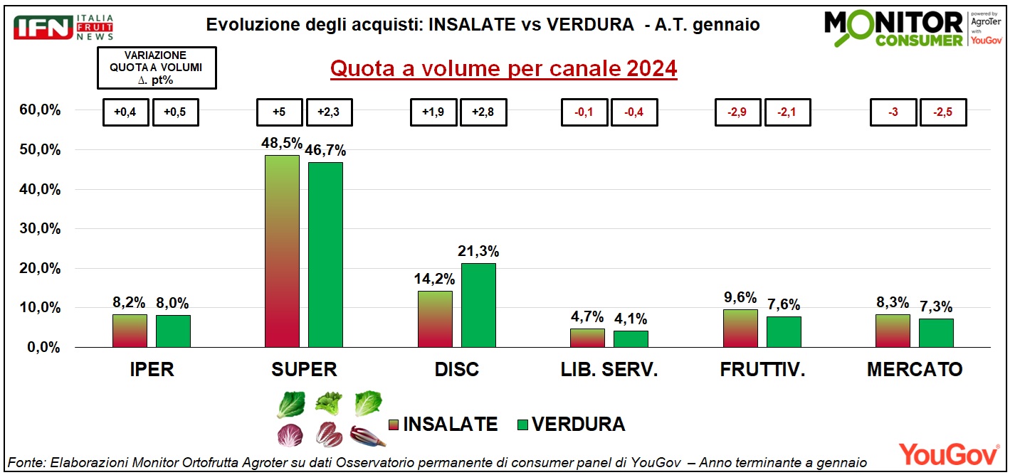 L’analisi per canale sulle insalate di prima gamma evidenzia il ruolo chiave dei negozi a libero servizio del retail tradizionale, con i supermercati in prima linea. Questi ultimi detengono la quota maggiore di volumi venduti (48,5%) e registrano la crescita più significativa (+5 punti), superando quella della verdura in generale (46,7%).