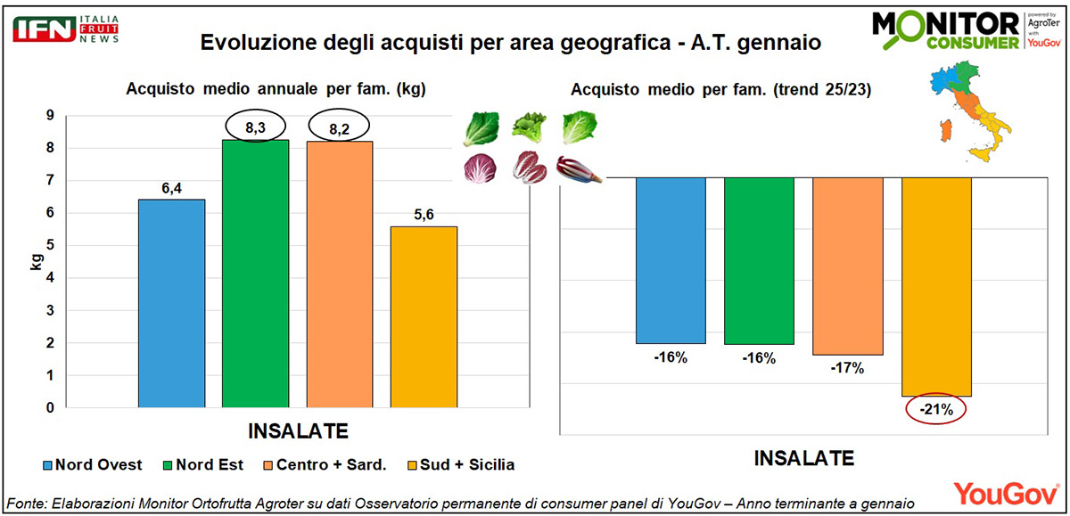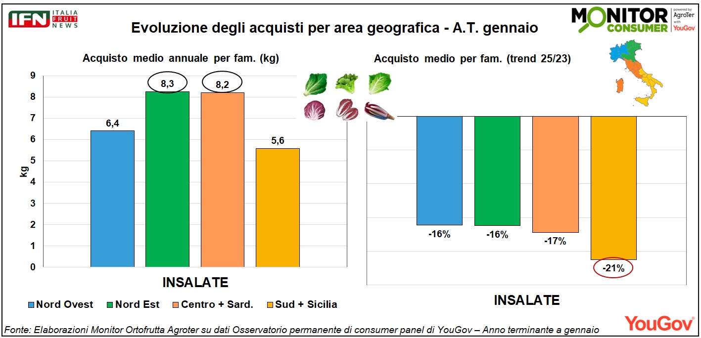 Chiudiamo con uno sguardo alle aree geografiche. L’acquisto medio annuale di insalate è più alto al Nord Est (8,3 chili) e al Centro (8,2 chili), mentre ha un dato intermedio al Nord Ovest (6,4 chili). Il consumo più basso, invece, si registra al Sud (5,6 chili), area in cui si osserva anche il trend più decrescente (-21%).