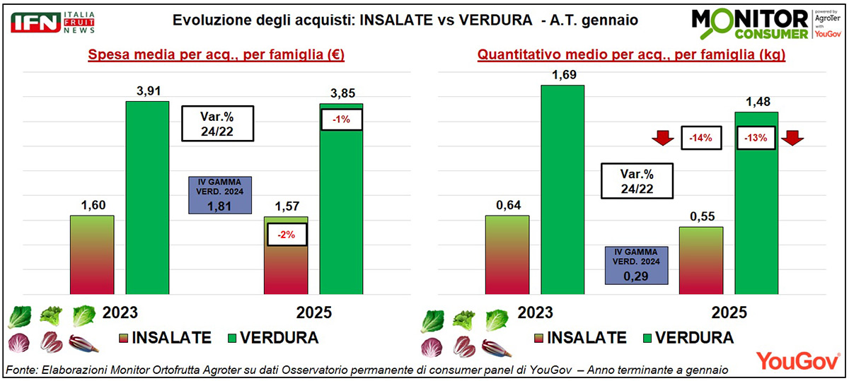 Una dinamica simile si osserva nel canale tradizionale, fruttivendoli e mercato, dove la quota di insalate è superiore rispetto alla verdura. Tuttavia, si registra una flessione delle quote e più marcata per le insalate, segnalando un progressivo spostamento degli acquisti verso la Gdo per questo segmento.