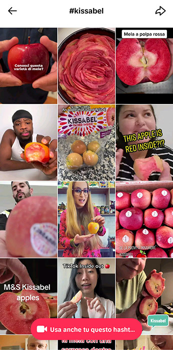Dal cuore sorprendente che va dal rosa al rosso intenso e dal gusto invitante, Kissabel – I’m red inside – conquista i consumatori e questo lo si nota anche dai social: il popolo del web, infatti, le ha dedicato diversi contenuti, facendola diventare a tutti gli effetti virale; infatti, se si ricerca tra il feed di Instagram e Tik Tok compaiono centinaia e centinaia di video dove la mela rossa è protagonista.