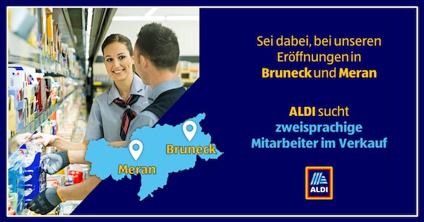 Prosegue intanto l’operazione di “recruitment” da parte di Aldi che, come mostra l’annuncio sopra, sta cercando personale da inserire nei due punti vendita di prossima inaugurazione in Alto Adige, a Brunico e Merano. La sfida è agli inizi.