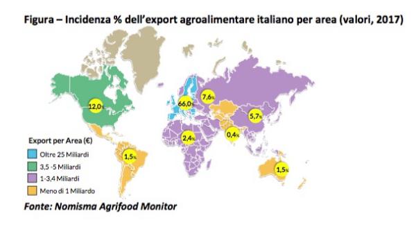 La presenza ridotta dei prodotti italiani nei mercati più distanti è un ulteriore evidenza di questi limiti: basti pensare che i due terzi dell’export agroalimentare italiano sono destinati a mercati “di prossimità”, cioè Paesi dell’Unione Europea, mentre la restante quota si distribuisce tra America (13,5%), Asia (9%), altri Paesi Europei (7,6%), Africa (2,4%), sebbene – e da qui si comprendono le ulteriori potenzialità inespresse del food&beverage italiano – nell’ultimo decennio il nostro export agroalimentare sia cresciuto del 229% verso il Medio Oriente, del 197% in Asia centrale, del 163% in Asia Orientale e del 123% nei paesi del centro-sud America.