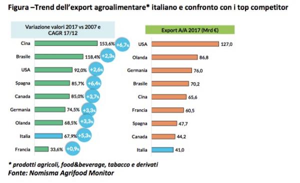 Basti pensare che tra il 2007 e il 2017 il valore delle esportazioni agroalimentari italiane è passato da 22 ad oltre 40 miliardi di euro, record storico, sebbene ancora lontano dall’ambizioso traguardo che il Paese si è dato dei 50 miliardi al 2020. In particolare, a trainare questa crescita sono settori tipici del Made in Italy come lattiero-caseario, carne e derivati, vino, che, a partire dal 2007, hanno fatto segnare incrementi medi annui dell’export superiori al 6%.