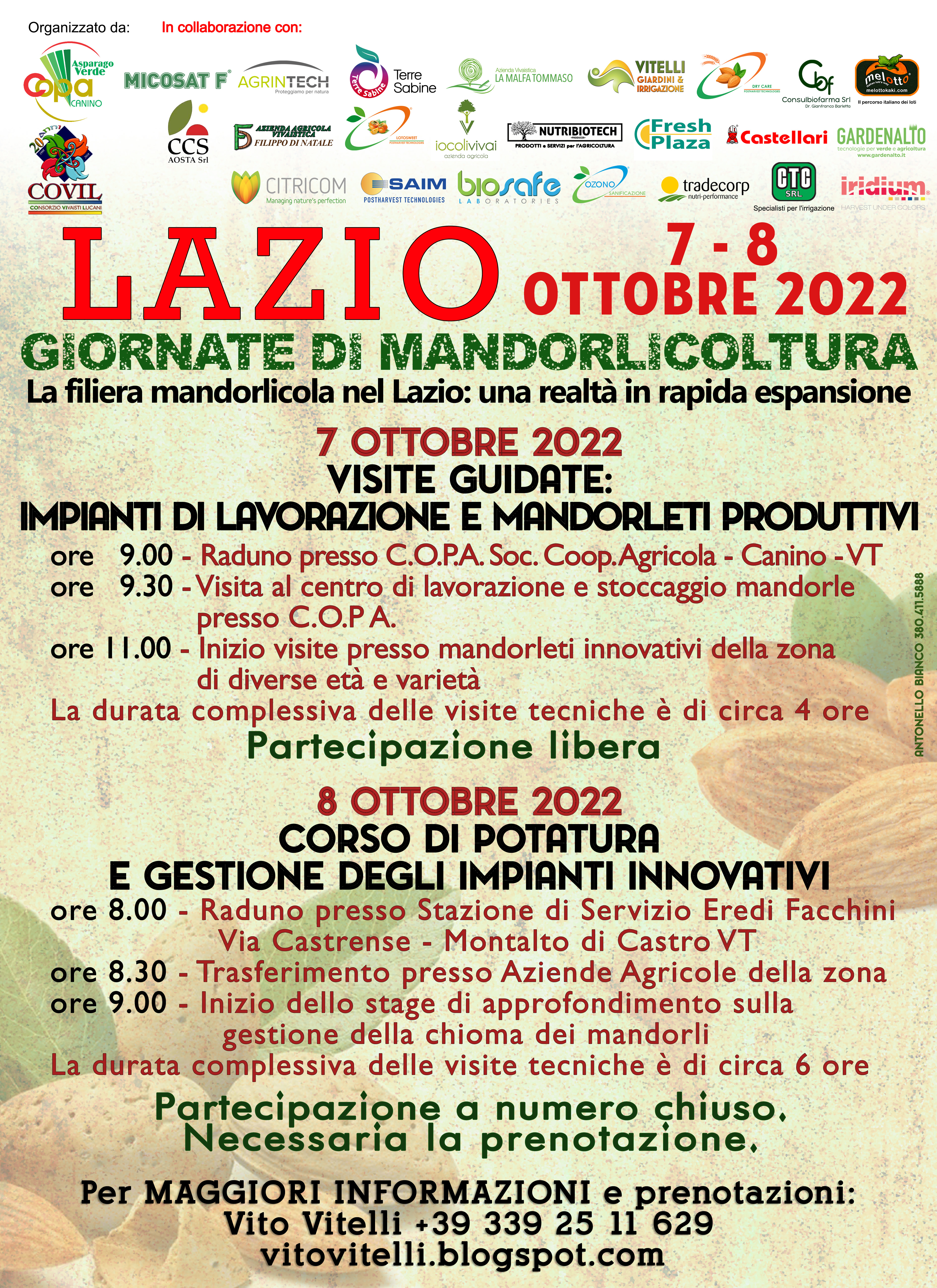 E proprio per diffondere le buone pratiche e gli obiettivi della mandorlicoltura laziale, sono in programma le Giornate tecniche di mandorlicoltura, previste venerdì 7 e sabato 8 ottobre.