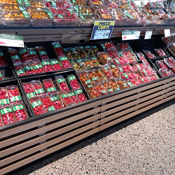 È evidente la predilezione alla massificazione dell’esposizione – suggellata dalla soluzione espositiva a “scalinata” in ingresso di reparto – sia di prodotti sfusi che confezionati, che si trovano all’interno dei classici imballi in plastica richiudibile. Rispetto ad altre catene si notano diverse referenze all’interno di bins, in particolare per angurie, meloni, pere e mele, venduti chiaramente a prezzi aggressivi.
