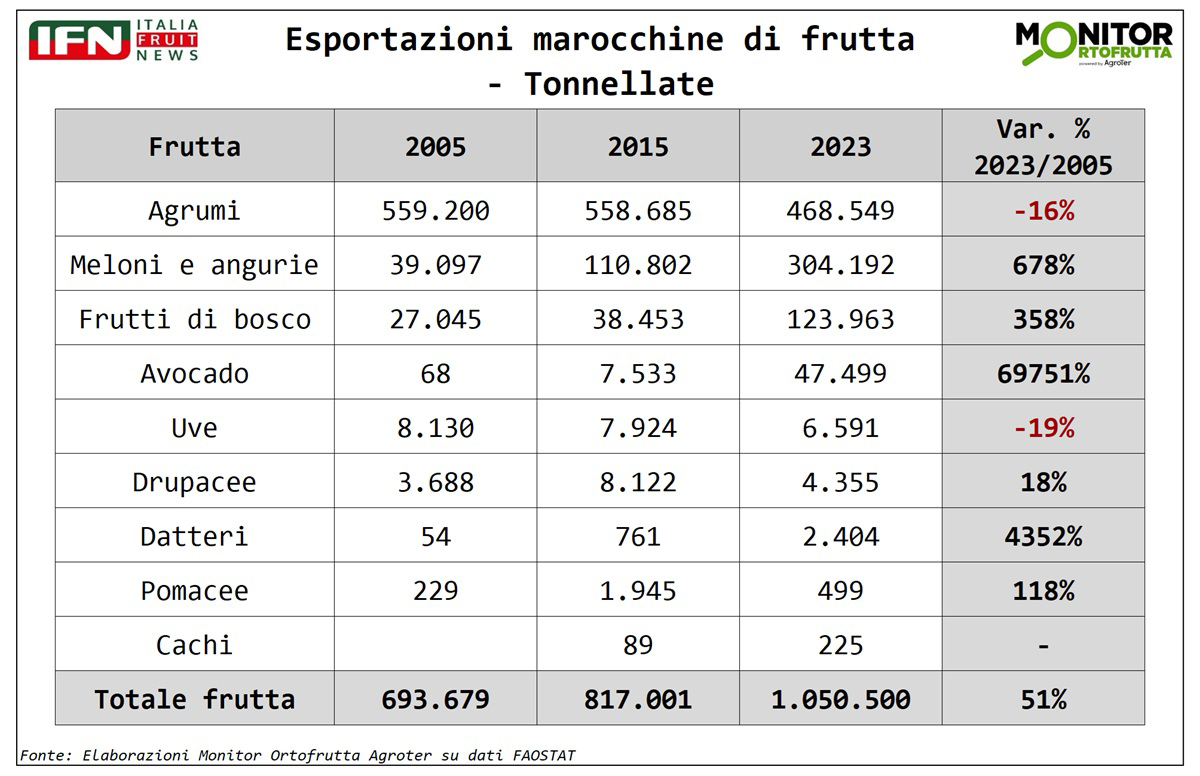 È evidente, come in vent’anni il Marocco abbia compiuto un vero salto di qualità, passando da esportatore regionale a protagonista riconosciuto nei mercati europei grazie a una strategia chiara: puntare da un lato su prodotti ad alto valore come avocado, frutti di bosco e pomodoro e, dall’altro lato, con prodotti con i quali può competere per l’ottimo rapporto qualità prezzo (vedi meloni, angurie e drupacee). Un percorso di crescita costante che conferma il Marocco come uno dei poli più competitivi e dinamici del Mediterraneo, sempre più orientato all’export e capace di rispondere rapidamente alle richieste del mercato europeo, anche in termini di prodotto certificato.