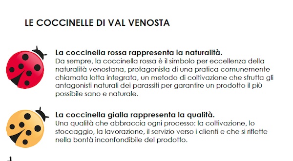 “Siamo passati da una molteplicità di elementi - ha proseguito - a pochi ma incisivi punti di riferimento: delle due coccinelle, quella gialla rappresenta la qualità, la rossa la naturalità; altri valori che vogliamo trasmettere con il brand sono l’origine, richiamata dal nome della valle di riferimento e la molteplicità dell’offerta, visto che Val Venosta non significa solo mele”.