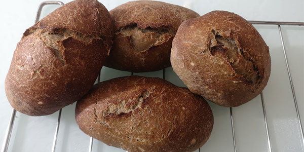 Il pane con farina di semi di melagrana, ideale per colazioni energizzanti con miele e confetture. L'aspetto è simile a quello di un pane integrale.