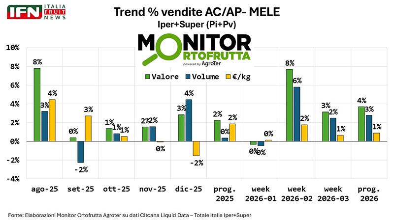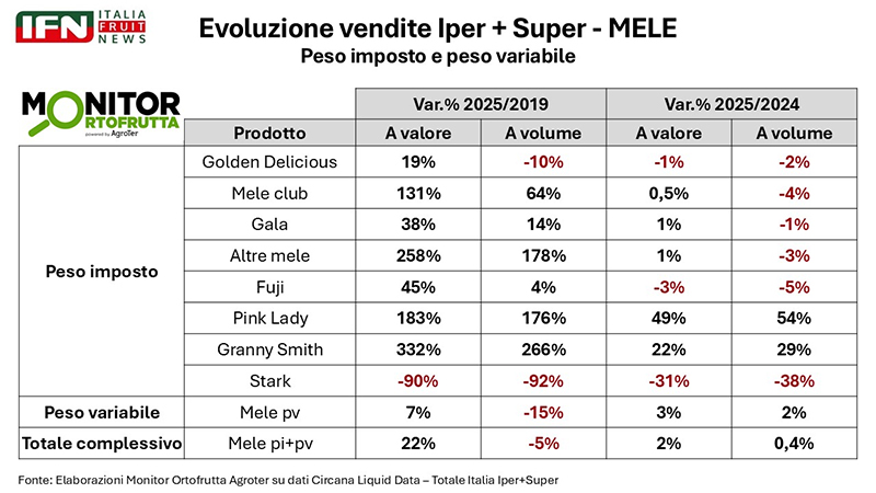 “Entrando nel dettaglio delle singole varietà – ha spiegato il direttore – l’analisi del confezionato mostra una crescita complessiva a valore praticamente per tutte le tipologie, con l’unica eccezione della Stark. Sul fronte dei volumi si registrano invece piccoli arretramenti per le varietà più consolidate, come Golden e Gala: un andamento in parte fisiologico, legato alla maturità di queste referenze. Al contrario, le nuove proposte stanno avanzando con decisione”.