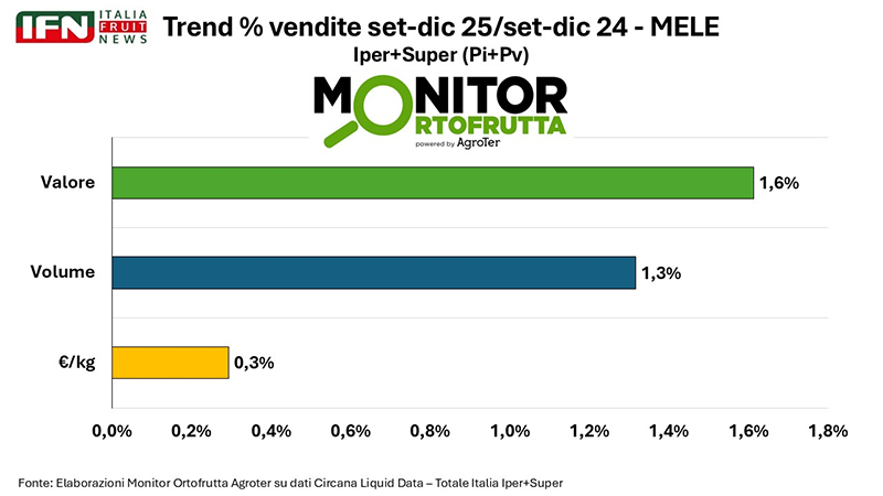 Ad aprire i lavori è stato il direttore di IFN, Roberto Della Casa, che ha tracciato il quadro produttivo nazionale e l’andamento del mercato al consumo delle mele: “Da agosto a dicembre i volumi mostrano una tendenza complessivamente positiva, con una chiusura d’anno in crescita anche sul fronte economico: +2% per prezzi e valore. Anche l’inizio del nuovo anno si presenta positivo, con un incremento sia dei volumi sia dei valori. In modo più sintetico, da settembre a dicembre 2025 rispetto al 2024 si registra un +1,3% in volume e un +1,6% in valore, con prezzi sostanzialmente stabili (+0,3%). Nel complesso, dunque, un bilancio positivo in uno scenario non certo semplice”.