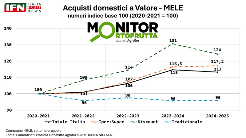 A rafforzare la chiave di lettura è intervenuto anche il direttore, richiamando la necessità di allargare l’orizzonte temporale dell’analisi: «Per comprendere con maggiore precisione cosa sta accadendo è importante leggere i dati su più anni. La serie storica evidenzia, a valore, una crescita del mercato di 13 punti rispetto alla campagna 2020-21, sostenuta dall’azione dei discount e del canale Iper+Super. Il tradizionale, invece, tende a soffrire, soprattutto sul fronte dei volumi, mentre la Gdo continua a crescere, pur con un rallentamento del discount. In questo quadro, Iper+Super mostrano performance solide».