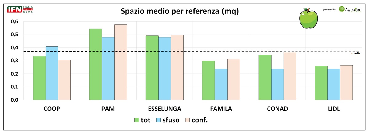 In termini di spazio espositivo medio per referenza, i livelli restano comunque elevati rispetto ad altre categorie. In Coop viene privilegiato il prodotto sfuso, con uno spazio relativamente maggiore, mentre negli altri punti vendita si tende a destinare più spazio alle referenze confezionate, spesso più impattanti visivamente e capaci di aggiungere note di colore allo scaffale.