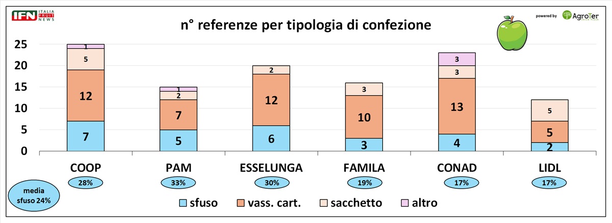 Attualmente, solo il 24% delle referenze è venduto sfuso, con un picco del 33% in Pam, mentre Conad e Lidl si fermano al 17%. Di conseguenza, il 76% dei prodotti (quini più di 3 su 4) è proposto in confezione, nella quale domina il vassoio in cartone: rappresenta infatti il 53% del totale e il 70% delle referenze confezionate. Questo formato conta 13 articoli in Conad, 12 in Coop ed Esselunga, e 10 in Famila, mentre Pam e Lidl si attestano rispettivamente su 7 e 5 referenze.