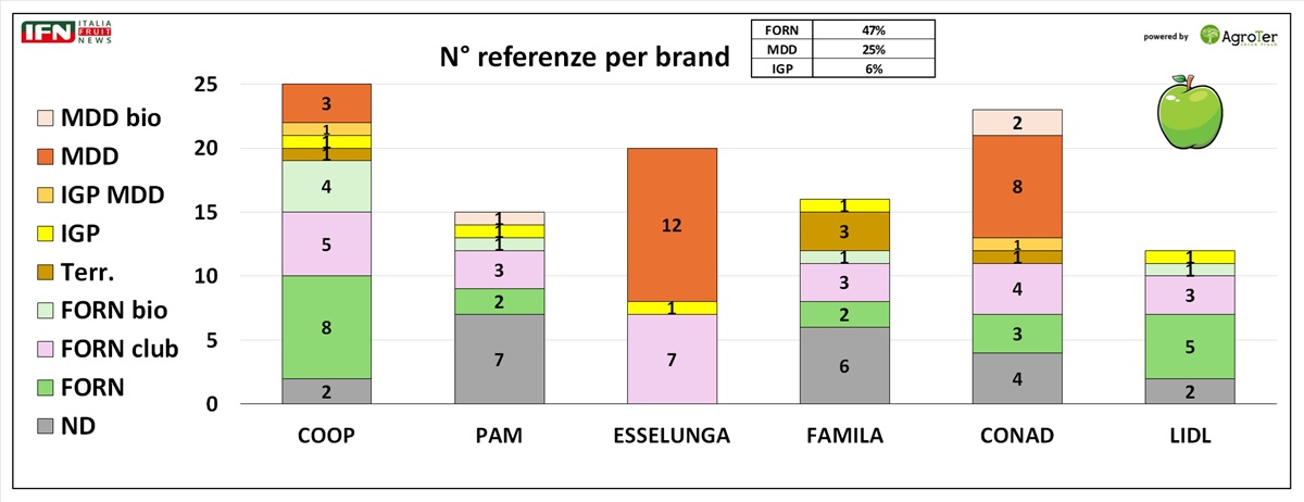 Esselunga è l’insegna che punta maggiormente sulle mele club, con 7 articoli a scaffale; Coop e Conad ne offrono rispettivamente 5 e 4, mentre le altre insegne si attestano su 3.