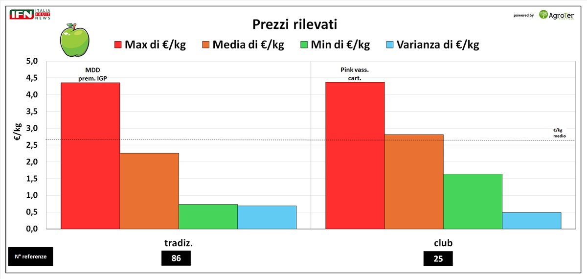 Fatta eccezione per i picchi di prezzo di alcune referenze Mdd Igp e della Pink Lady in vassoio, che si avvicinano ai 4,5 €/kg, la media complessiva si attesta poco sopra i 2,5 €/kg: leggermente inferiore per le varietà tradizionali e di poco superiore per le club.