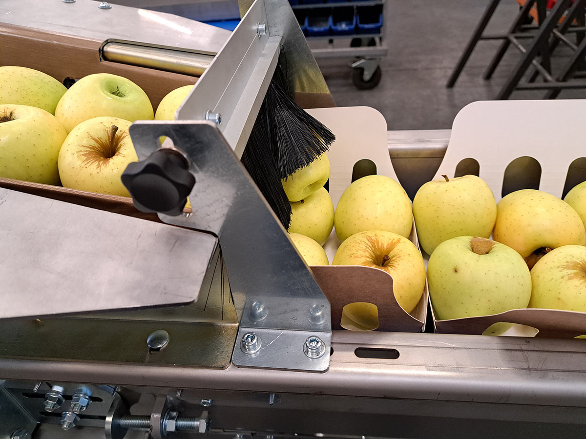 La Linea di riempimento e chiusura dei vassoi in cartone si compone di un deimpilatore automatico dei vassoi, modello DB-F115, di un riempitore Easypack, modello EP-F115, e della macchina per la chiusura ed etichettatura dei vassoi, modello FBC-F115. Il riempitore è alimentato con un sistema di nastri divergenti ed è in grado di gestire vassoi da 4, 6 e 8 frutti di tutte le tipologie, non solo mele. La chiuditrice ed etichettatrice si connota per una grande flessibilità di utilizzo, può infatti passare velocemente da un formato di vassoi a un altro grazie a un software che memorizza le impostazioni per ciascuno di essi.