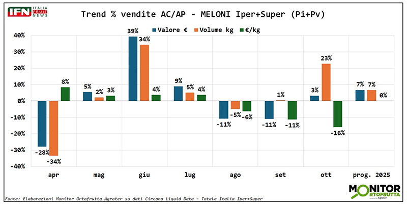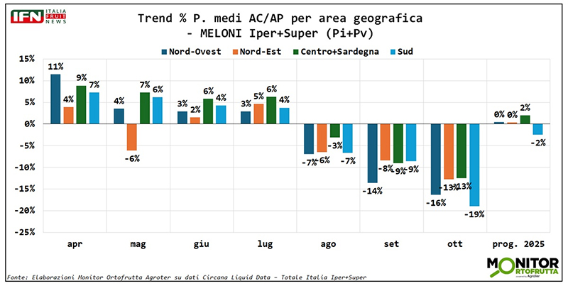 Luglio prosegue il trend positivo (+9% valore, +5% volume), ma già in agosto la dinamica cambia nuovamente: il melone torna in territorio negativo, con cali dell’11% a valore e del 5% a volume. La flessione è generalizzata e riaffiora anche nella componente prezzi, che scende su tutte le aree. A settembre la situazione non migliora: valore e volume arretrano ancora dell’11%, con il Nord-Est che registra il calo più pesante (–15% a volume). Ottobre sorprende con un rimbalzo avolume (+23%), ma questa volta a fronte di un valore molto più moderato (+3%) e di un prezzo medio in forte contrazione in tutto il Paese, fino al –19% nel Sud.