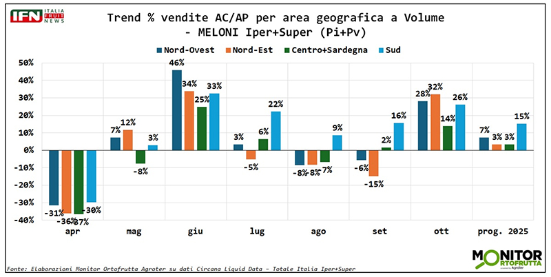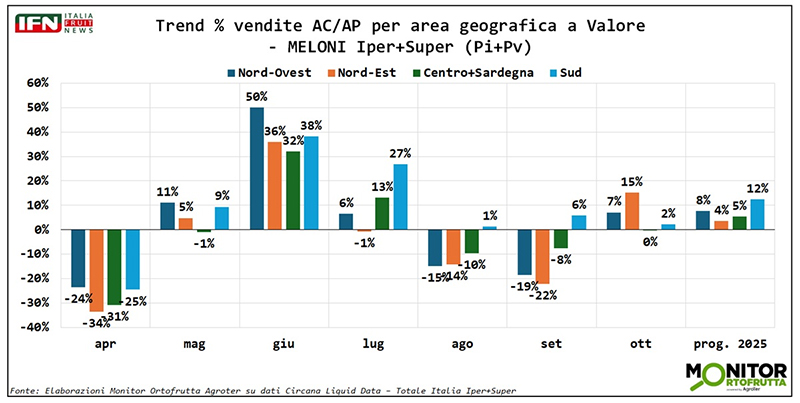 Il progressivo annuale, tuttavia, restituisce un quadro meno drammatico: il melone chiude il 2025 con un +7% a valore e +7% a volume nel totale Iper+Super, segno che i picchi positivi di giugno e luglio hanno compensato parte delle criticità di agosto e settembre. A livello geografico, la crescita del volume è distribuita in modo disomogeneo: il Sud guida (+15%), seguito da Nord-Ovest (+7%) e Centro-Sardegna (+3%). Anche a valore lo scenario è positivo ovunque, con performance migliori nel Sud (+12%) e nel Nord-Est (+8%).