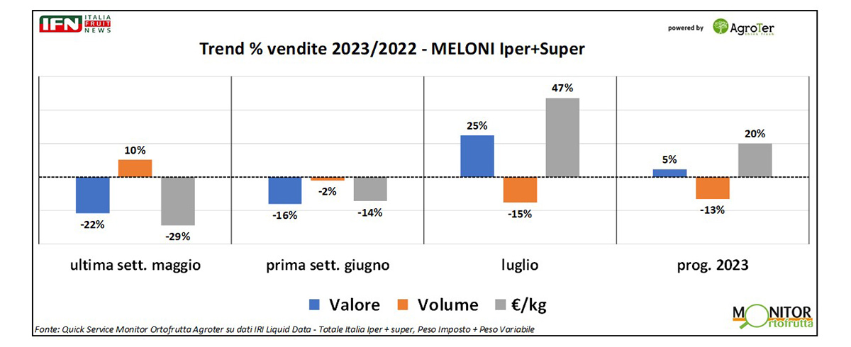Con la fine di agosto è tempo dei primi bilanci per la campagna dei meloni 2023. Una stagione a dir poco schizofrenica, come evidenziano i dati del Monitor ortofrutta di Agroter relativi ai canali iper+super: fra fine maggio e inizio giugno i prezzi, rispetto allo scorso anno, sono calati di circa il 20%, mentre a luglio sono cresciuti di quasi il 50%; il progressivo della campagna a metà agosto segna +5% a valore, -13% a volume e +20% in termini di quotazioni.