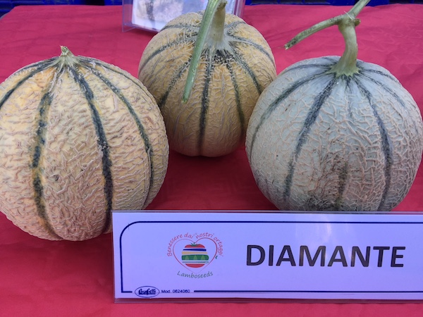 Diamante F1 si contraddistingue per il frutto retato, piccolo e tondo (1,2-1,5 kg). La polpa, di colore arancio intenso, è croccante, serbevole e dolcissima.