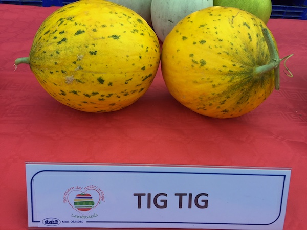 Tig Tig si presenta come una via di mezzo tra il Piel de sapo e il gialletto: i frutti sono ovali a buccia gialla, screziati di verde alla raccolta, e la polpa, di colore bianco, è dolcissima. La pianta è mediamente vigorosa, il ciclo di maturazione medio.