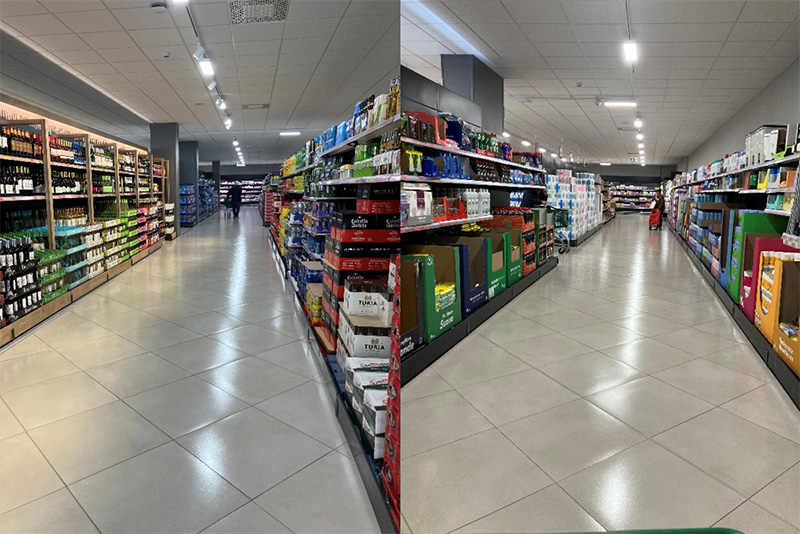 Le corsie principali appaiono particolarmente ampie e il ruolo assegnato ai freschi emerge già nelle prime battute del percorso. Gastronomia e latticini acquistano visibilità in prossimità dell’ingresso e oltre l’area dei piatti pronti, mentre il cuore del punto vendita è occupato per metà dalla frutta e verdura fresca. Si rafforza così l’idea di una sorta di “mercato centrale” interno al supermercato, in cui l’ortofrutta assume una funzione scenografica ma anche strategica. A valorizzarla contribuisce pure la luce naturale che accompagna il percorso verso le casse, collocate accanto a una grande vetrata affacciata sulla strada: un dettaglio che accentua i colori e la percezione di freschezza del reparto.