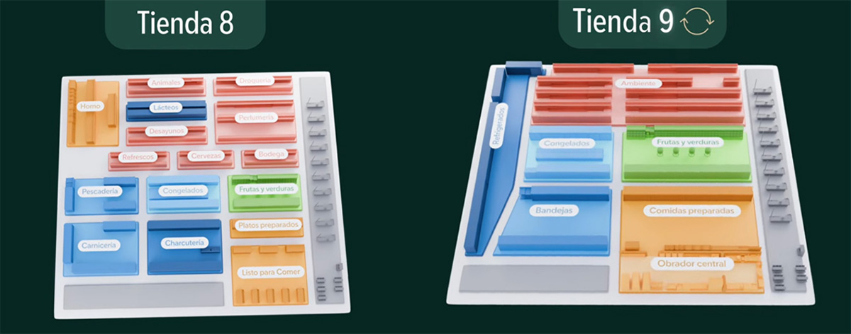L'evoluzione voluta da Juan Roig riorganizza gli spazi in funzione dei processi, amplia le corsie, introduce aree per il consumo immediato e rafforza il ruolo dell’ortofrutta