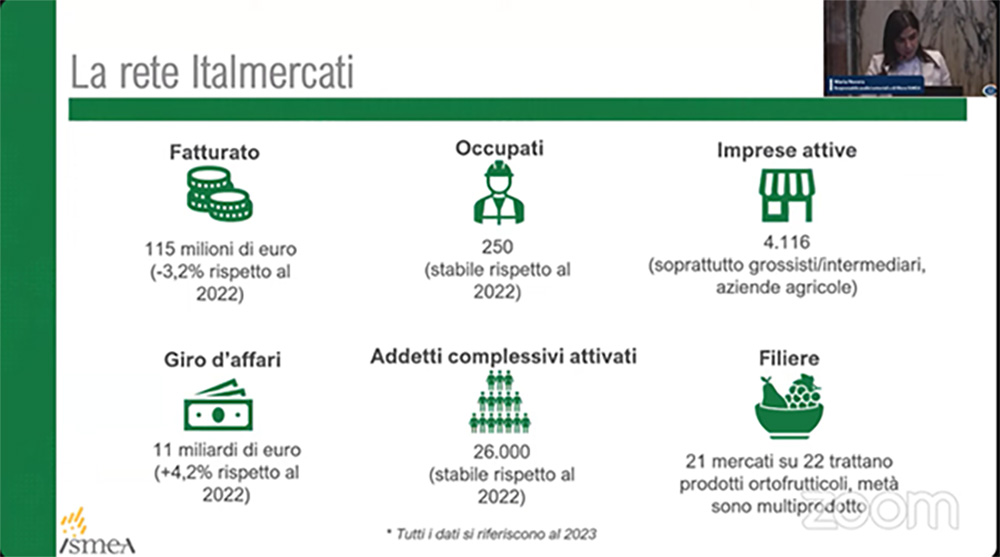 Lo studio di ISMEA sul network di Italmercati, costituito da una rete di 22 strutture, distribuite in 14 regioni italiane, quantifica un giro d’affari di 115 milioni di euro, un valore che raggiunge la ragguardevole cifra di 11 miliardi se si considerano anche le attività delle 4.000 realtà economiche operative nei mercati, tra distributori, aziende agricole, bar, ristoranti, facility provider e servizi accessori, con il coinvolgimento quotidiano di 26 mila addetti.