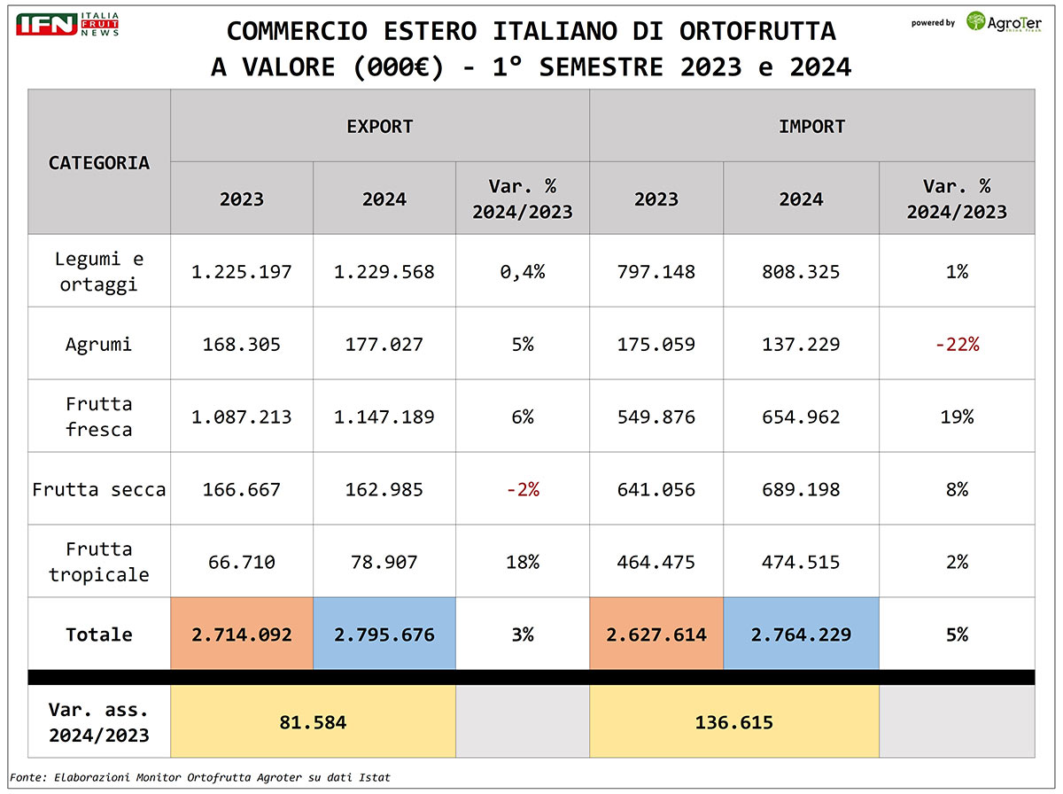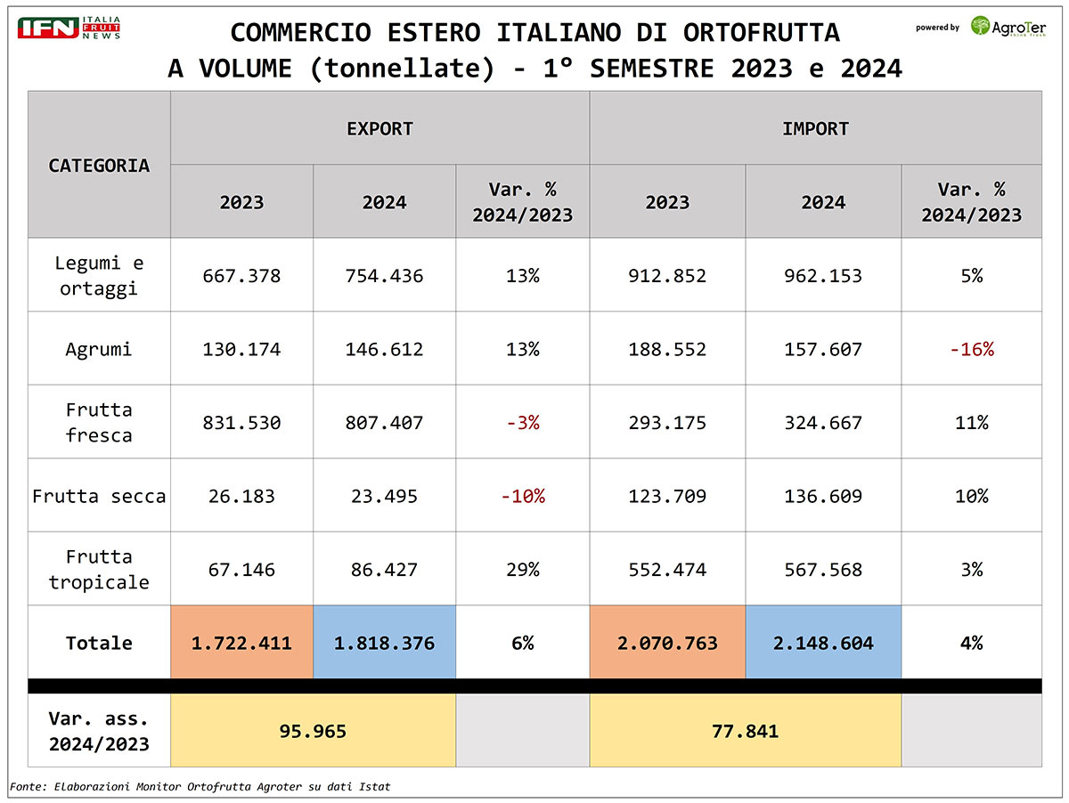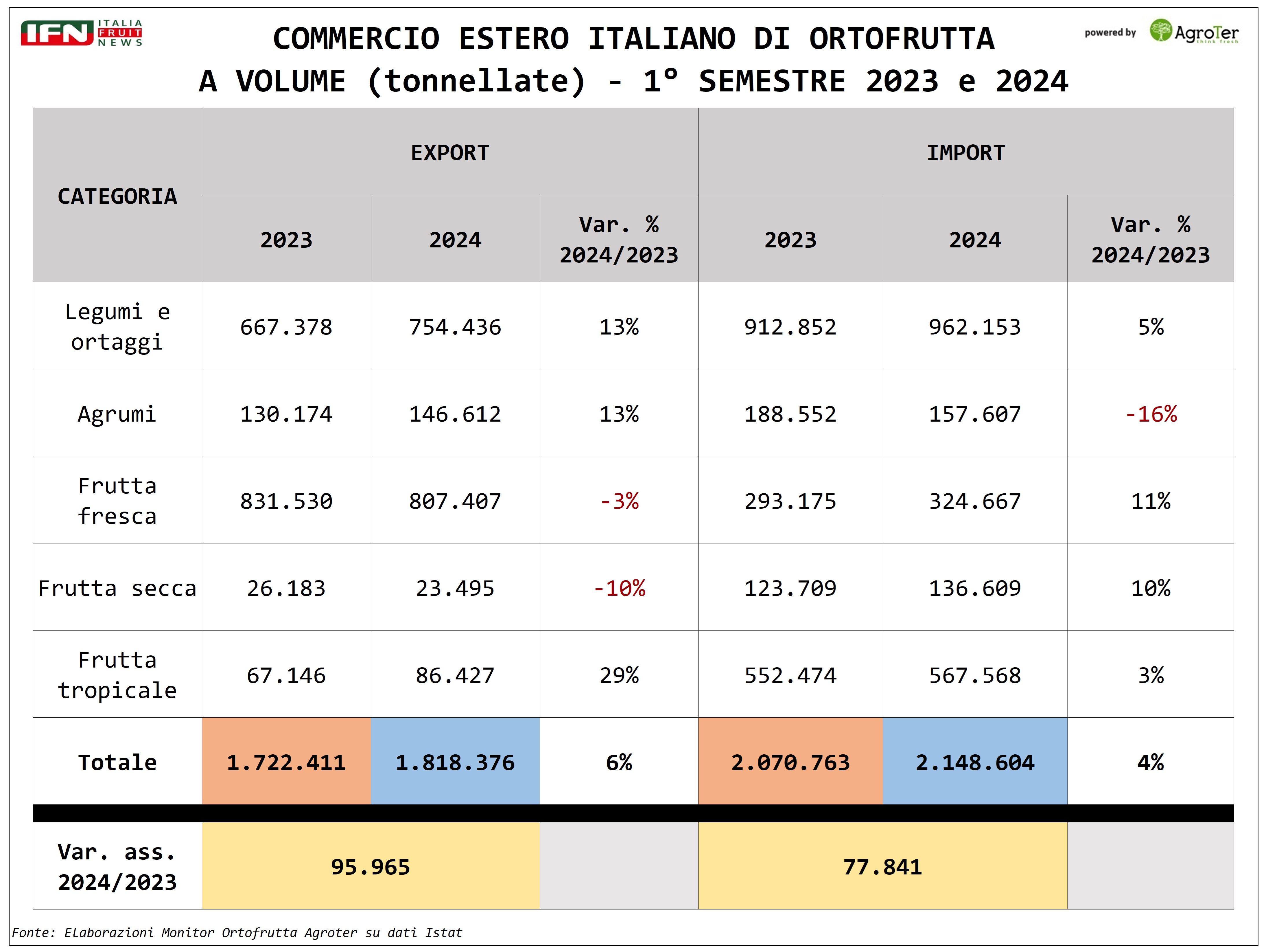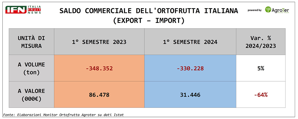 Nel primo semestre del 2024, il commercio ortofrutticolo italiano su scala internazionale mostra segnali di ripresa: il saldo commerciale a volume registra un incremento del 5% rispetto allo stesso periodo dell’anno precedente, sebbene il disavanzo resti significativo (-330 mila tonnellate). Tuttavia, il corrispettivo a valore è positivo (+31 milioni di euro) e, anche se il calo del 64% rispetto al 2023, fa vedere il bicchiere mezzo pieno.