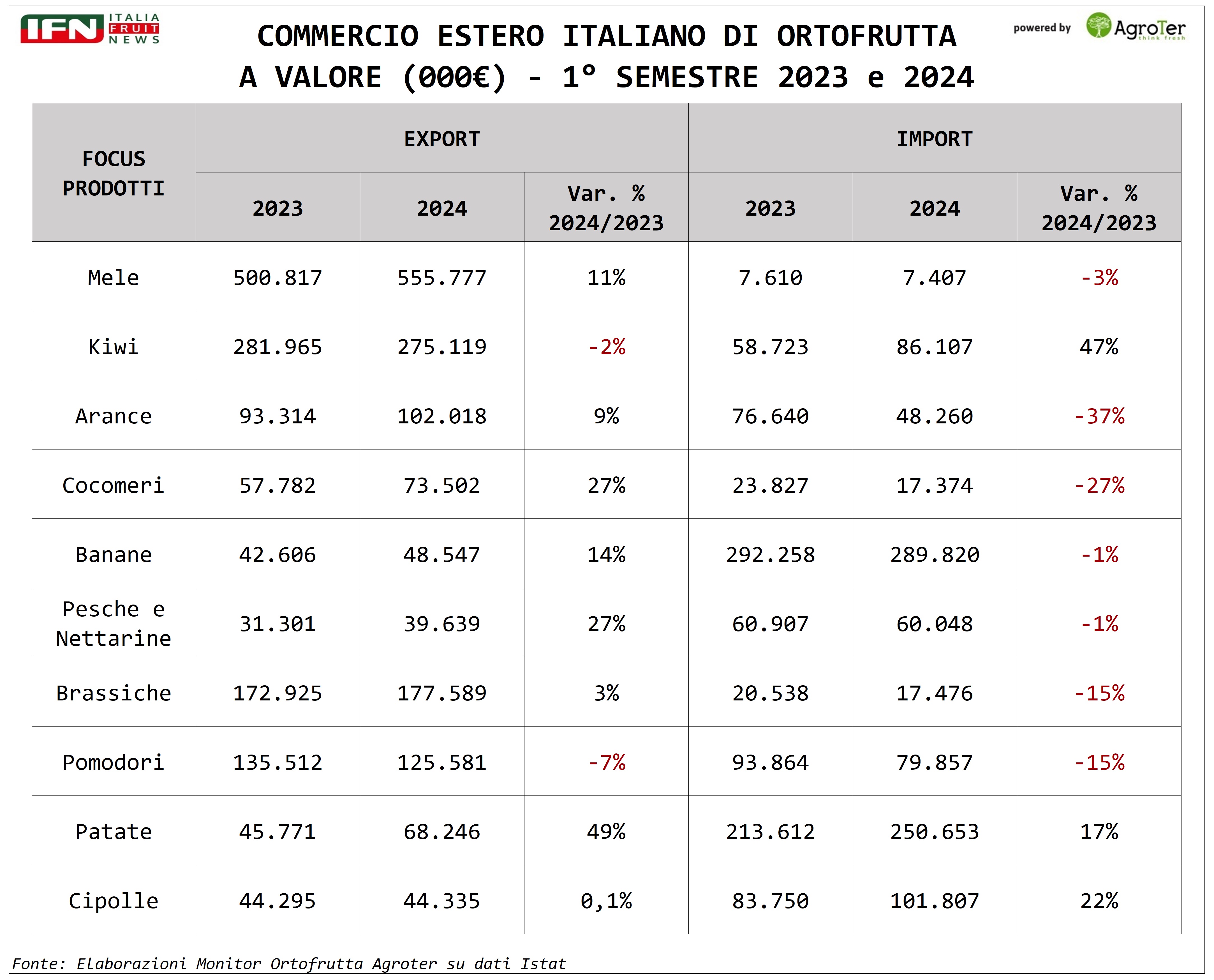 Approfondendo l’analisi sui prodotti chiave, in testa alle esportazioni si collocano le mele, con più di 476 mila tonnellate spedite; un quantitativo che rimane praticamente invariato dall’anno scorso e con un guadagno nel corrispettivo a valore pari all’11%. Da archiviare, invece, la performance negativa dei kiwi, con volumi esportati inferiori del 30%, ma con prezzi alti che hanno contenuto la perdita nel valore (-2%). Sono partite bene le spedizioni di angurie italiane, che nei primi sei mesi, sono cresciute a doppia cifra (+33% a volume, +27% a valore), così come l’export di pesche e nettarine, in aumento sia nel volume (+46%) che nel valore (+27%). Bene anche il commercio verso l’estero di banane e arance che ricalcano trend positivi.