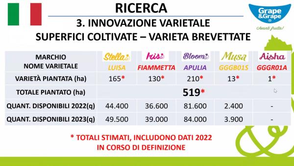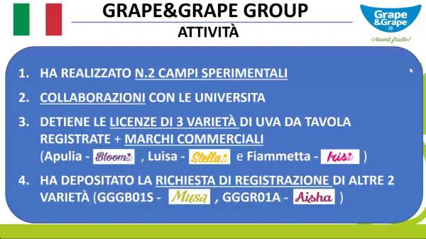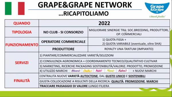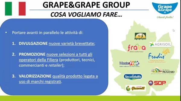 Lo hanno spiegato i responsabili della società venerdì pomeriggio nell'ambito di un incontro online, dove è stata presentata l'idea di costituire un consorzio per piantare e far piantare varietà Made in Italy gestite dal progetto Grape&Grape, commercializzarle con una formula che valorizzi qualità e brand, usando marchi commerciali condivisi su cui spingere con promozioni e azioni di brand identity a favore di retailer italiani ed esteri.