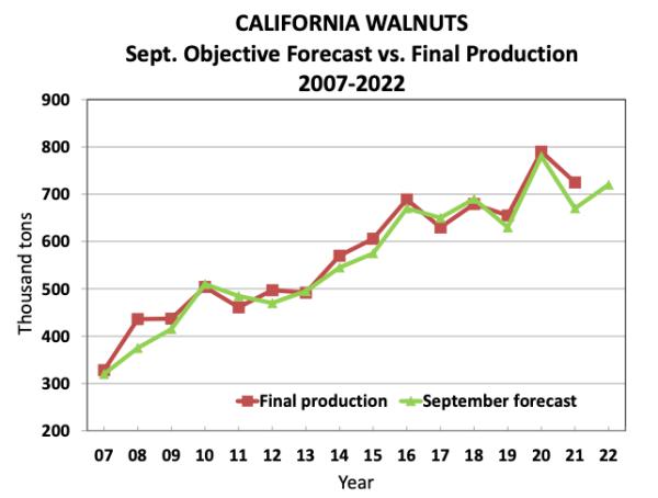 Intanto il Dipartimento Usa dell'Agricoltura ha diffuso le stime di produzione delle noci della California: per il 2022 si parla di 720.000 tonnellate, in calo dell'1% rispetto alla produzione del 2021. La superficie dedicata è invece cresciuta del 3%. Questi dati sono contenuti nel The Walnut O.M. Survey, indagine iniziata nel 1958 per soddisfare le esigenze del settore per una previsione accurata della produzione di noci prima della raccolta.
